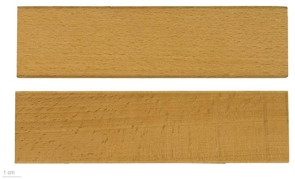 C’est un bois clair très sobre, allant du gris blanc au rosé clair, et au veinage peu apparent. Il se reconnaît facilement grâce à ses petits pointillés plus foncés présents sous certains angles.